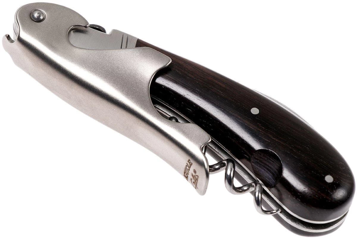 Con el sacacorchos de camarero Laguiole Magnum de Fontenille Pataud abrirás tu botella de vino de la misma manera que lo haría un sumiller. El cuchillo combina tres funciones: es un corta cápsulas, sacacorchos y abrebotellas. Hecho por los fabricantes de cuchillos franceses Fontenille Pataud. Este sacacorchos de camarero tiene un mango hecho de ébano y acero inoxidable que le proporciona un diseño elegante y estilizado.