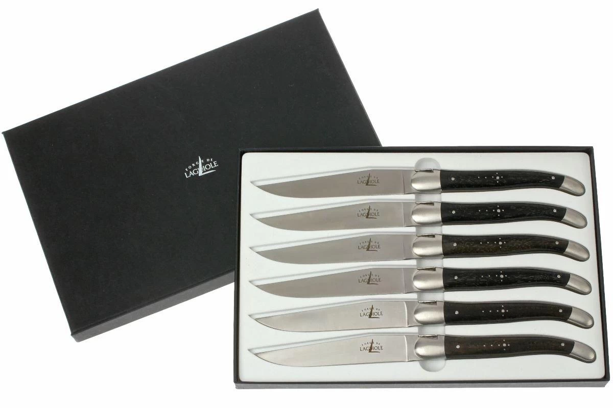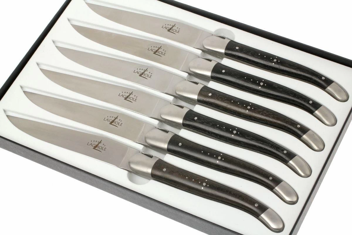 Este juego de cuchillos de mesa Forge de Laguiole se compone de seis hermosos cuchillos hechos a mano. La hoja afilada tiene un núcleo de acero inoxidable francés y conserva su filo durante mucho tiempo. Las escalas de madera de ébano irradian lujo y están equipadas con la característica cruz de pastor en forma de siete remaches. Y, por supuesto, la típica abeja de Laguiole también se encuentra en el lomo de las hojas.