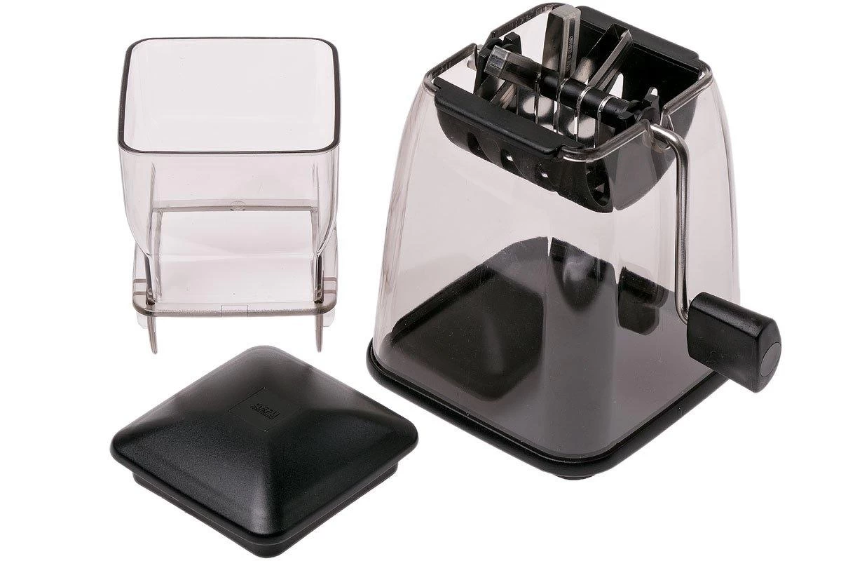 Con el cortador de cubos GEFU los cubos de verduras nunca han sido tan fáciles de hacer. Perfecto para cortar cebollas, tomates, pimientos u otras verduras. Cada pieza será cortada con precisión y perfección, no picada. Es ideal para una tostada, una pizza o una ensalada. Añade los trozos grandes al recipiente de recogida. Al girar la palanca, las hojas comenzarán a girar. Los cubos caerán en el contenedor de recogida que también pueden servir como contenedor de almacenamiento. Con la tapa incluida se puede cerrar fácilmente el recipiente. Los cuchillos son de acero inoxidable. Las demás piezas son de plástico. Sin embargo, todas las piezas pueden limpiarse a mano o en el lavavajillas.