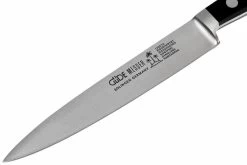Santoku de la colección Alpha de Güde. Este santoku tiene un filo de granton, que está pensado para evitar que las rodajas finas de comida se peguen a la hoja.