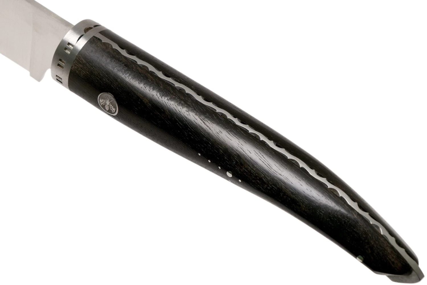 El cuchillo de chef Gourmet de Laguiole en Aubrac de 15 cm es un cuchillo de cocina artesanal pequeño, elegante y versátil. Destacan la gran «barriga» y la punta puntiaguda. Debido a esta forma, el centro del cuchillo es bastante grande, lo que facilita el corte de un trozo de carne o de verduras en pedazos. El filo estrecho hacia la punta es perfecto para las tareas más detalladas. Estos cuchillos se fabrican a mano en Espalion, Francia.