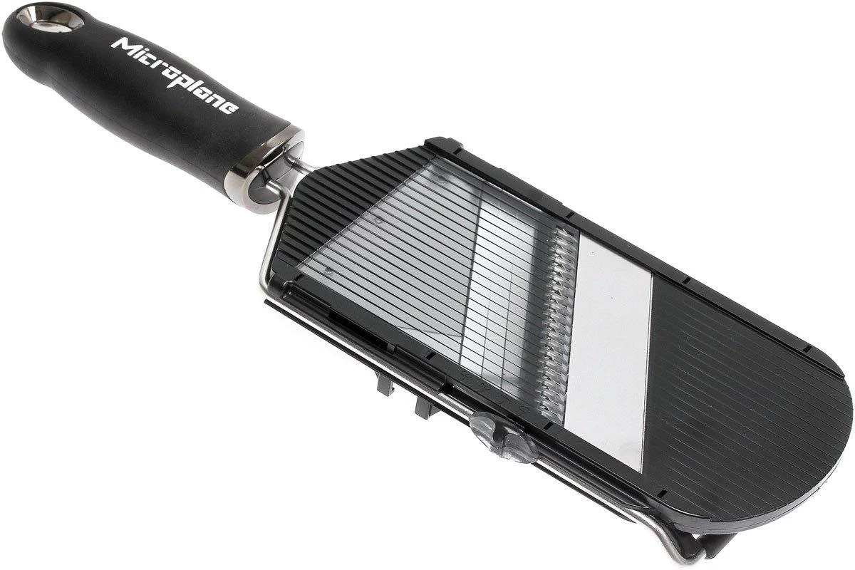 La mandolina manual de Microplane Specialties es una alternativa compacta y asequible para una mandolina grande. Cortar rodajas con un grosor de 1 a 3 mm es un juego de niños con esta mandolina. Estos espesores se ajustan fácilmente con la corredera del borde de la hoja. El cuchillo juliana produce tiras de 3 mm de ancho. El grosor de las tiras se ajusta con la misma corredera que se utiliza para ajustar el grosor de las lonchas.