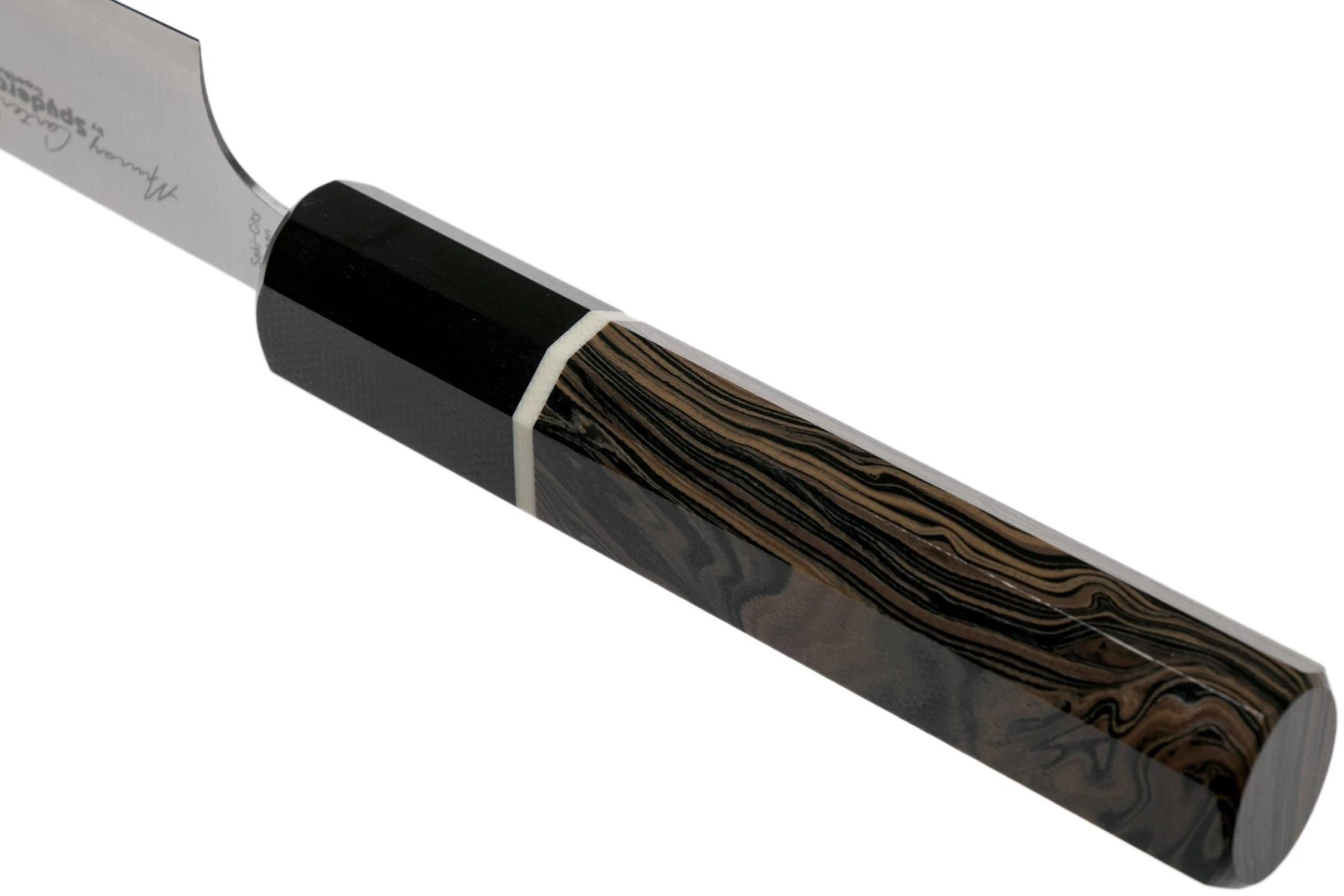 De la palabra francesa «petit» que significa «pequeño», este cuchillo Petty es el equivalente a un cuchillo pelador occidental. Perfecto para pelar y cortar frutas y verduras y para hacer guarniciones detalladas para dar ese toque final.