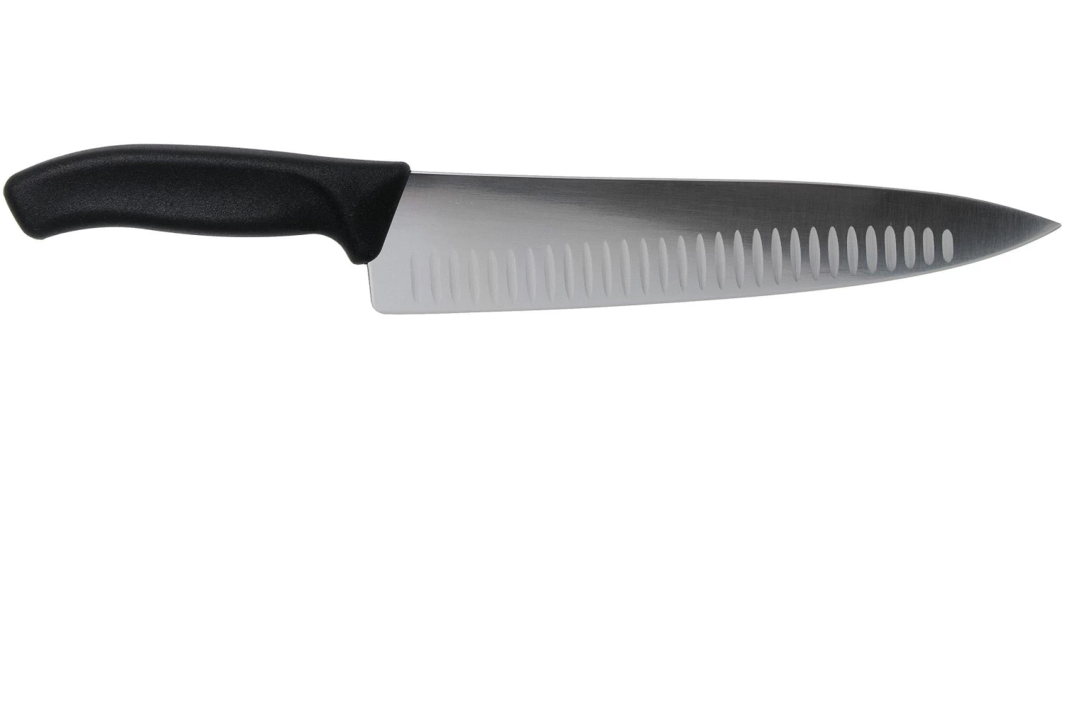 El cuchillo para trinchar Victorinox SwissClassic con hoyuelos 25 cm, negro es un cuchillo para trinchar de gran tamaño. La hoja de 25 cm de longitud corta fácilmente grandes trozos de carne La cuchilla extralarga también permite realizar cortes más grandes. Los hoyuelos de la hoja garantizan que los alimentos no se le peguen. Genial si quieres cortar el rosbif en rodajas bonitas.