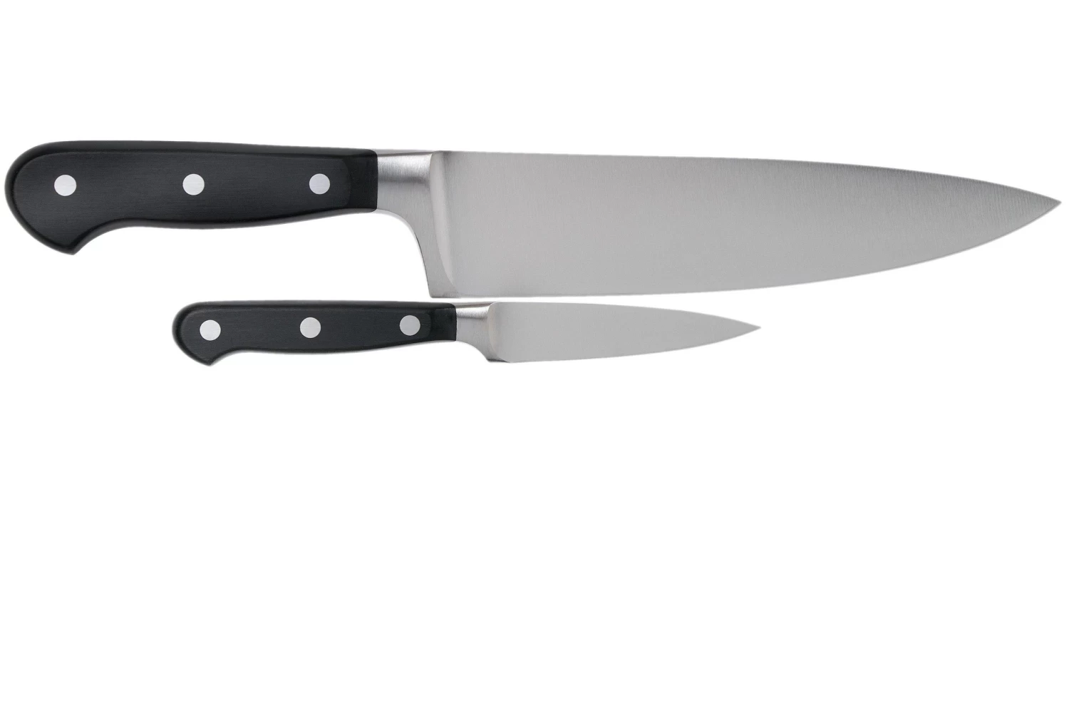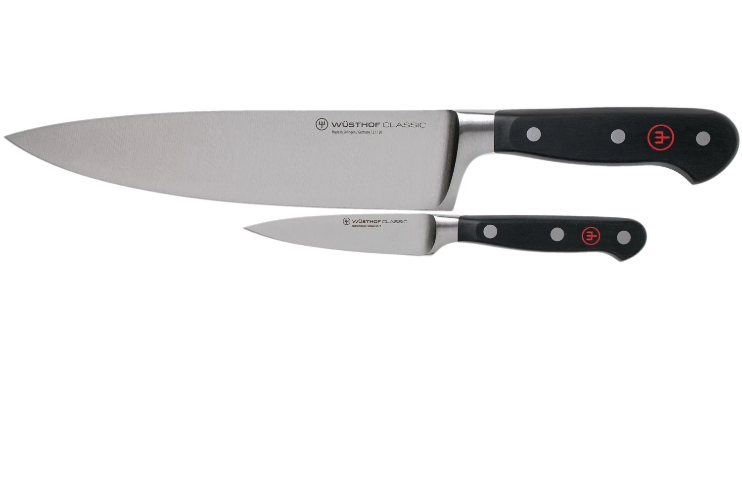 Este Juego de cuchillos Wüsthof Classic de 2 piezas es un juego bueno y asequible para experimentar la diferencia que pueden marcar los cuchillos de primera calidad. Con el cuchillo de chef puedes solucionar cualquier tarea grande en la cocina y con el cuchillo puntilla todas las pequeñas.